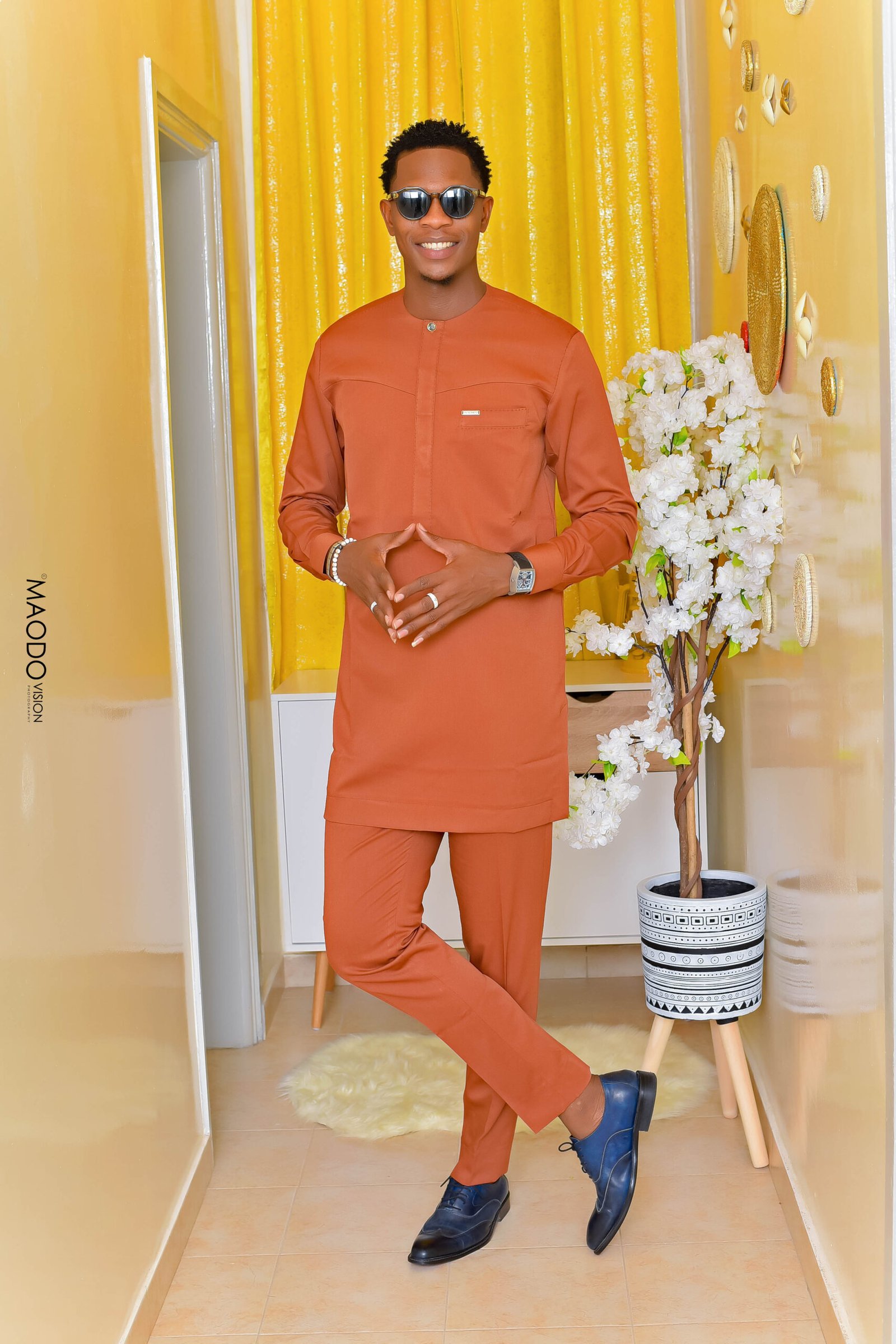 Cet ensemble traditionnel pour homme séduit par sa teinte rouille vibrante et son allure raffinée. Le haut, à manches longues et coupe droite, offre une silhouette nette et structurée, idéale pour les occasions formelles ou festives. Le pantalon assorti complète l’ensemble avec sobriété, garantissant confort et élégance. Les accessoires discrets tels que la montre et les bagues ajoutent une touche personnelle sans alourdir le style.
