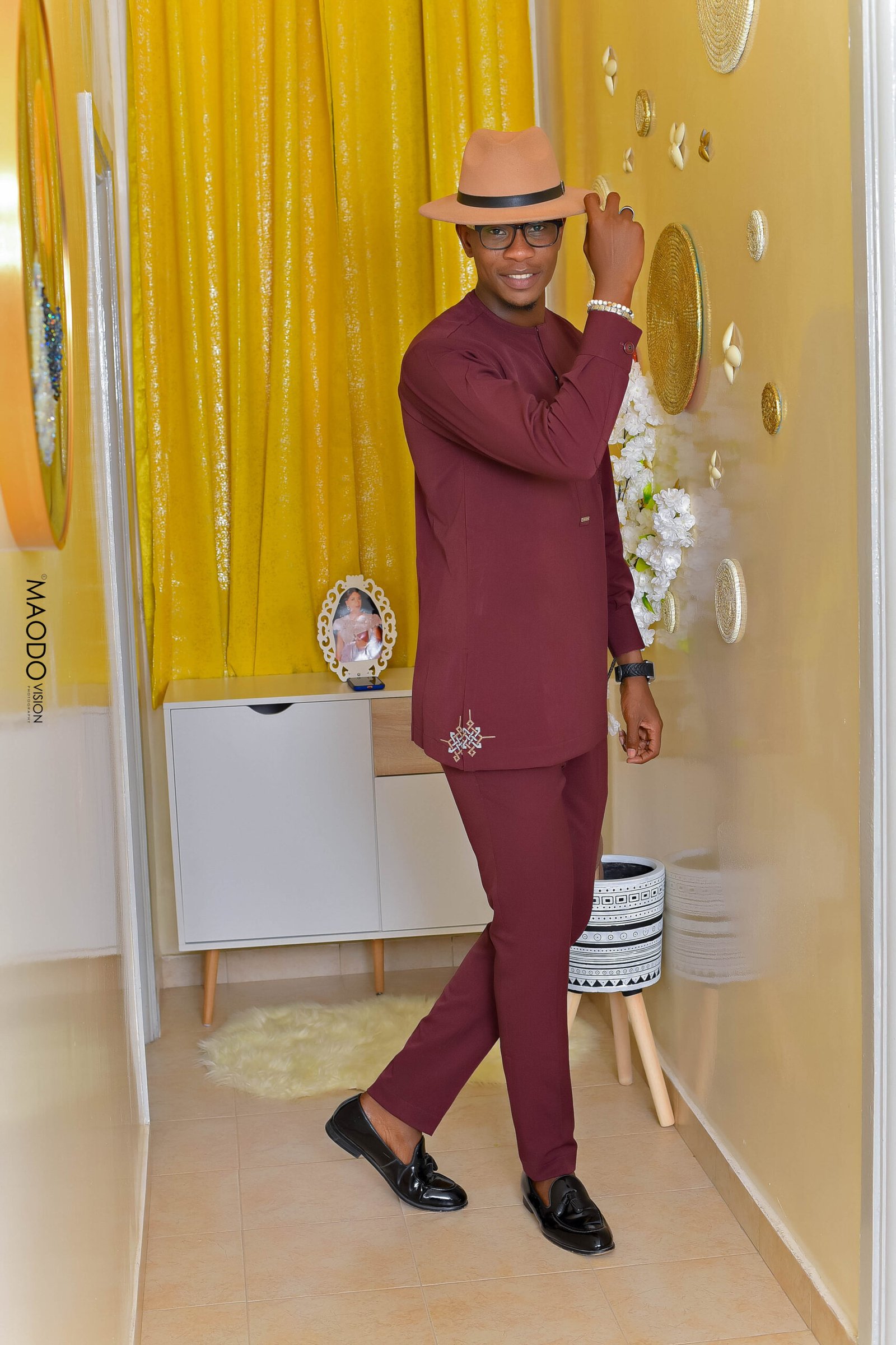 Ensemble tradi-moderne bordeaux à la coupe moderne, élégant et raffiné, parfait pour une allure distinguée lors des grandes occasions.